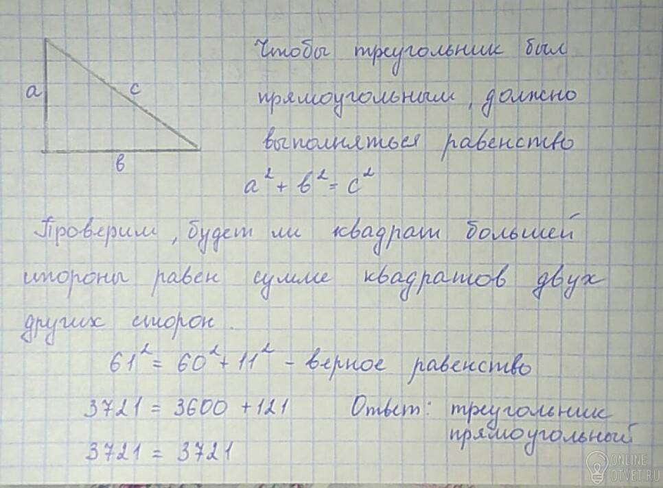 Ответ: треугольник со сторонами 11 см, 60 см и 61 см будет прямоугольным.
