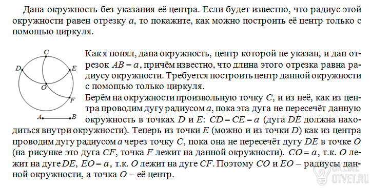Дана окружность без указания её центра. Если будет известно, что радиус этой окружности равен отрезку "a", то покажите, как можно построить её центр только с помощью циркуля.