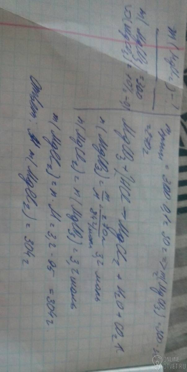 Какая масса соли получиться при взаимодействии 300 г карбоната магния ,содержащего 10% примесей с соляной кислотой,помогите решить очень прошу пожалуйста,ибо 2 завтра получу