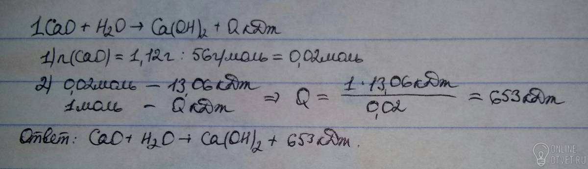 При взаимодействии 1,12 г жженой извести (СаО) с водой выделилось 13,06 кДж энергии. Составьте термохимическое уравнение этой реакции .