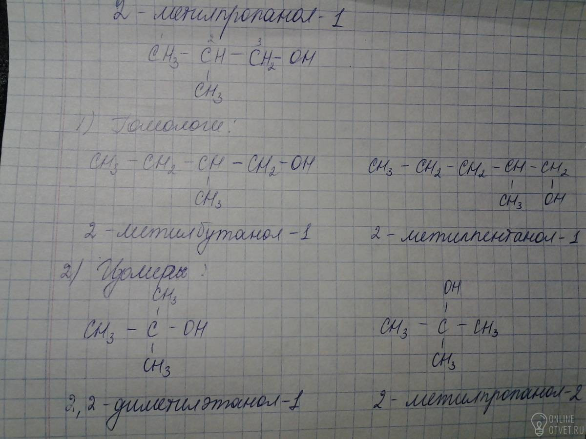 для вещества 2-метилпропанол - 1 напишите структурную формулу и составьте 2 гомолога и 2 изомера.