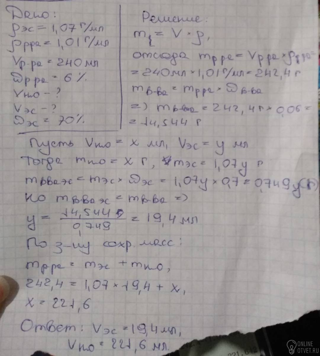 Какие объёмы воды и уксусной эссенции(70%) необходимо для приготовления 240 мл 6% раствора? плотность эссенции 1,07г/мл. плотность раствора 1,01г/мл.