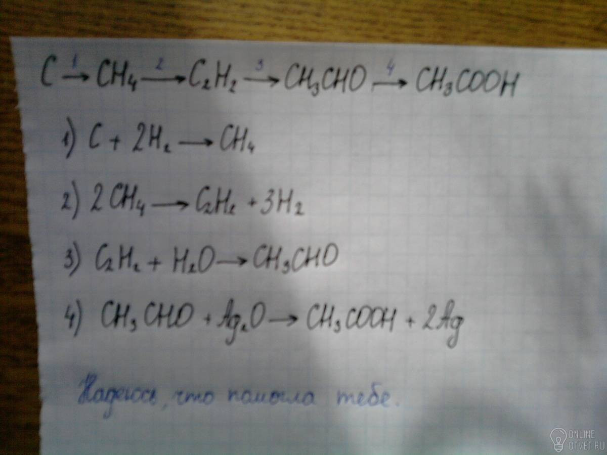 Составить уравнения реакций по приведенной схеме и указать их осуществление : C->CH4->C2H2->CH3CHO->CH3COOH помогите плиз