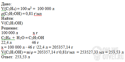 Рассчитайте объем этанола (плотность 0,81 г/мл), который теоретически можно получить из 100 м^3 этилена (н.у.).