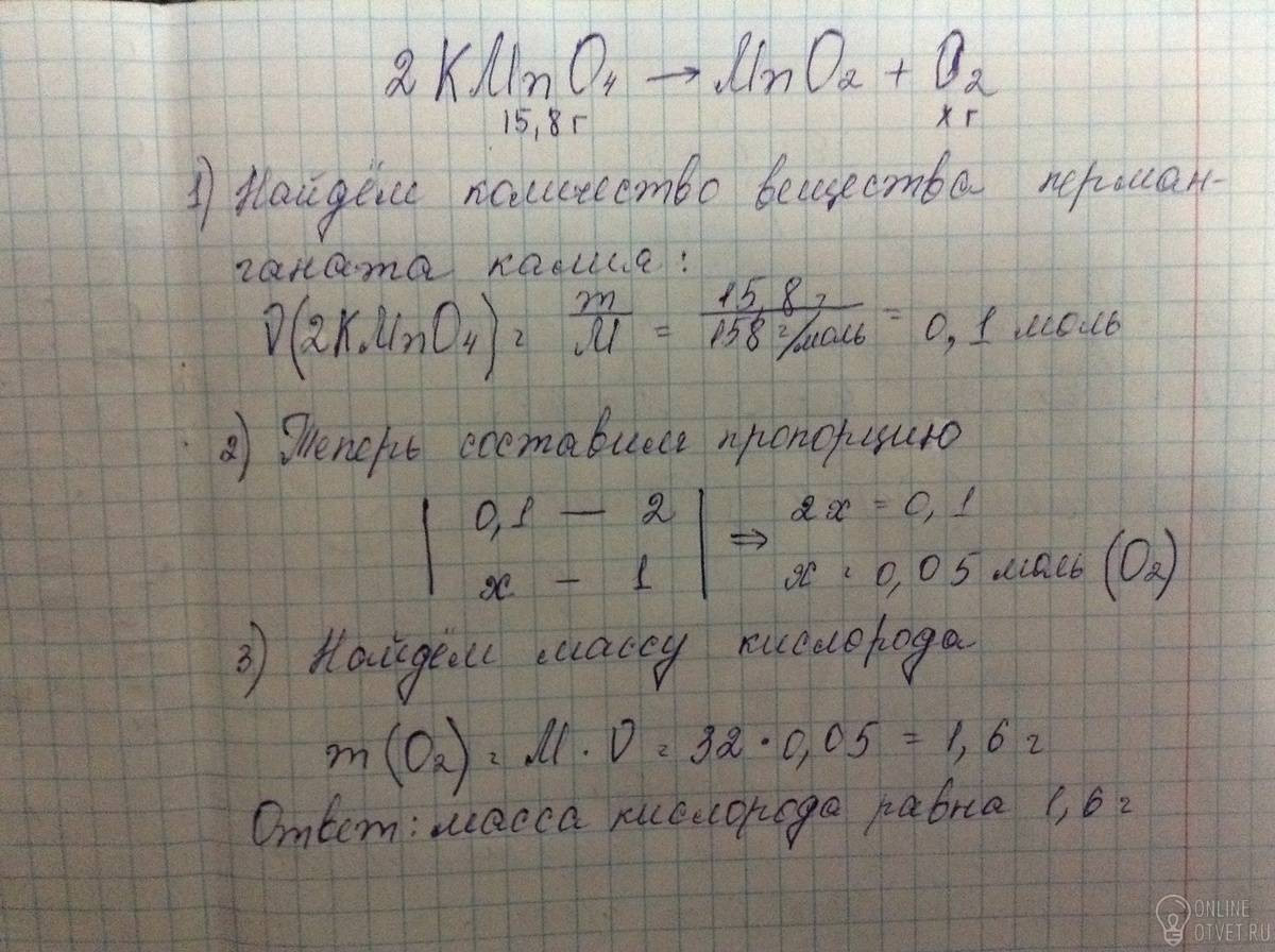 Рассчитайте химическое количество кислорода, которое образуется при разложении перманганата калия массой 15,8 г, по уравнению химической реакции: 2КМп04 —> К2МпО4 + Мп02 + 02.