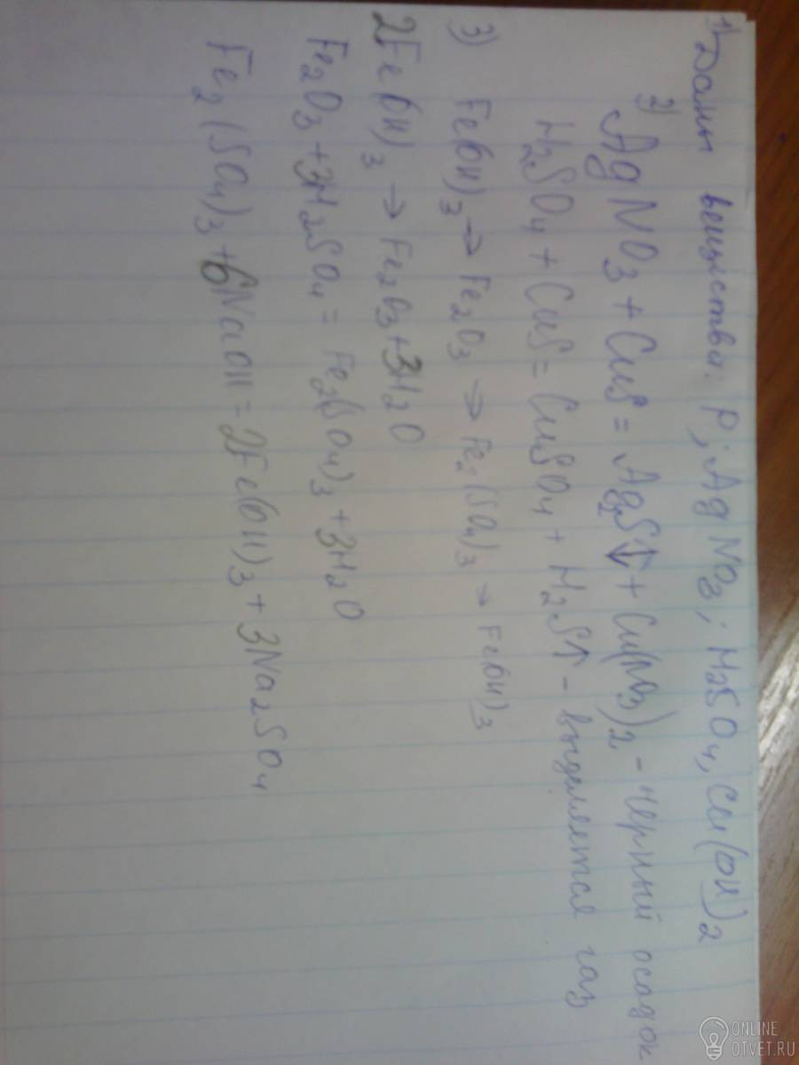 Помоги пожалуйста с дз по химии 1)Даны вещества:фосфор,нитрат серебра,серная кислота,гидроксид меди 2.Какие из этих веществ будут взаимодействовать с сульфидом меди?Напишите уравнения соответствующих реакций 2)Осуществите цепочку превращений: Fe(OH)3-Fe2O3-Fe2(SO4)3-Fe(OH)3