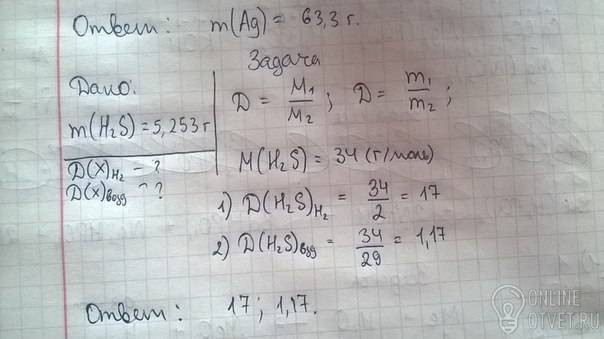 Масса сероводорода H2S (н.у) равна 5.253г. Вычислить плотность сероводорода по водороду и воздуху