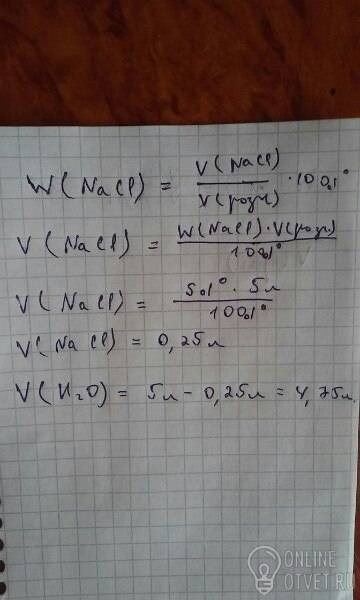 В 5 л розчину міститься обєм води і натрій хлор .тобто потрібно знайти обєм води і натрій хлор.за формулою знаходимо обєм натрій хлор і щоб знайти обєм води віднімаєм від обєму розчину масу натрій хлор