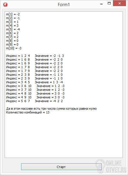 Memo1.Lines.Append('Да в этом массиве есть три числа сумма которых равна нулю')