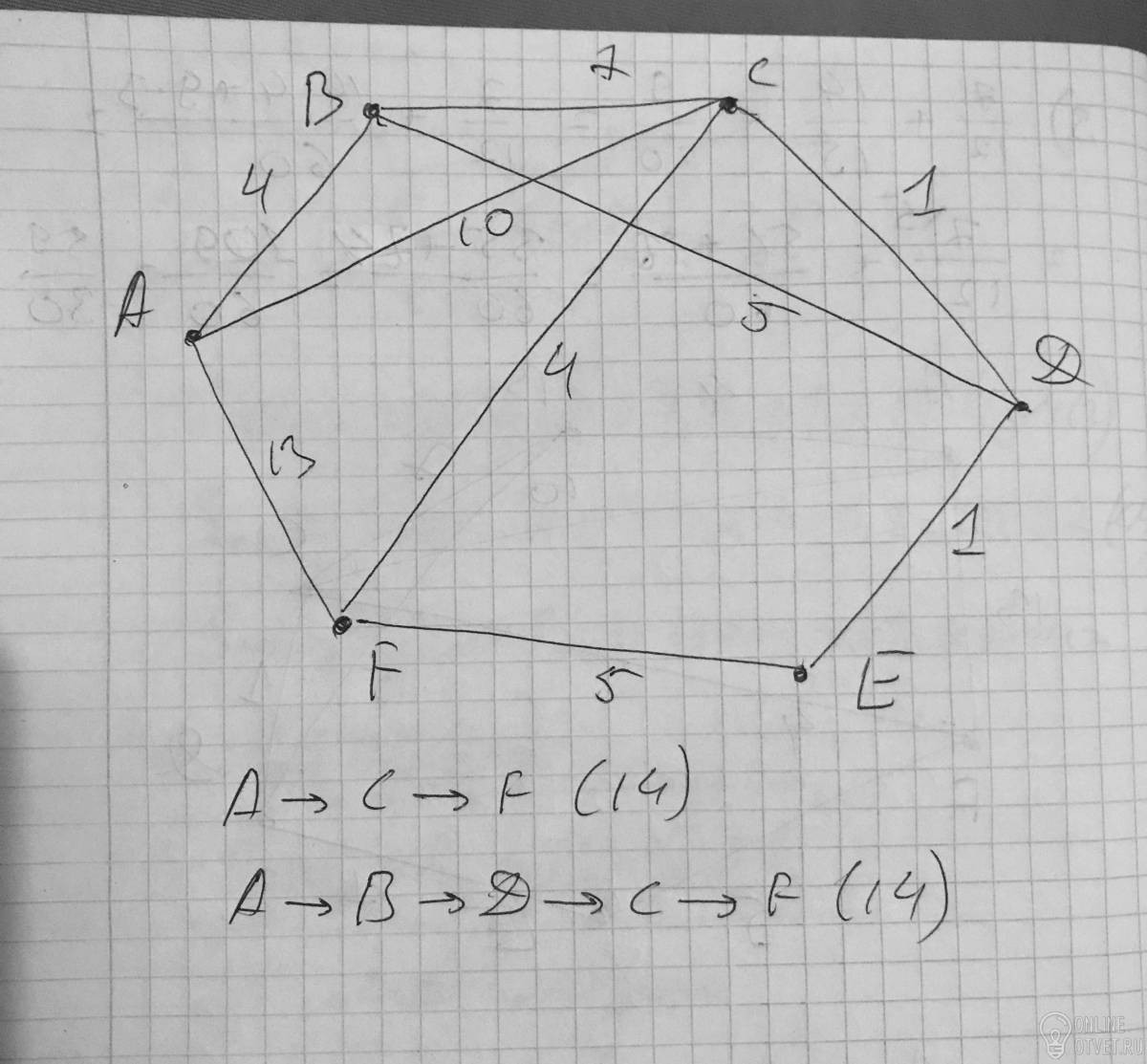 Из рисунка наглядно видно, что длина кратчайшего пути между А и F равна 14