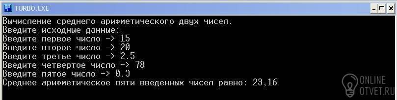 Write('Среднее арифметическое пяти введенных чисел равно: ');
