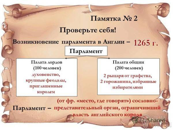Становление и развитие происходило в период с 8-15вв. Парламент развивался, учась на своих ошибках, благодаря ему Англия представляла наиболее свободную в политическом и правовом смысле страну, наиболее мощное государство всего западного мира, центр огромной колониальной империи, существование которой также обеспечивало политическую стабильность в стране. Короли не имели права собирать налоги без разрешение на то парламента. В случае войны король созывал парламент , разрешавший ему собирать единовременный налог определенного размера.