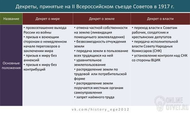 напишу только декреты.в первую очередь они проводились для крестьян.ну к власти пришли большевики уже законно после принятых декретов.особо на крестьян эти декреты не повлияли, а на помещиков сильным образом и на государство в первую очередь