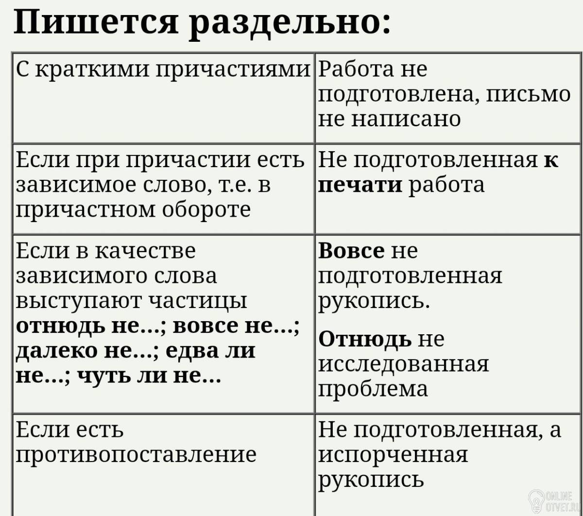 Пишется раздельно если: работа не подготовлена, письмо не написано, с краткими причастиями и если есть противопоставление.